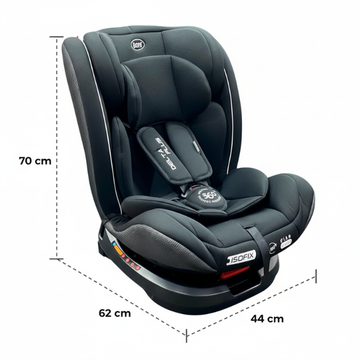 Silla de auto giratoria 360° con sistema ISOfix, reclinación múltiple y uso prolongado desde 0 hasta 36 kg.