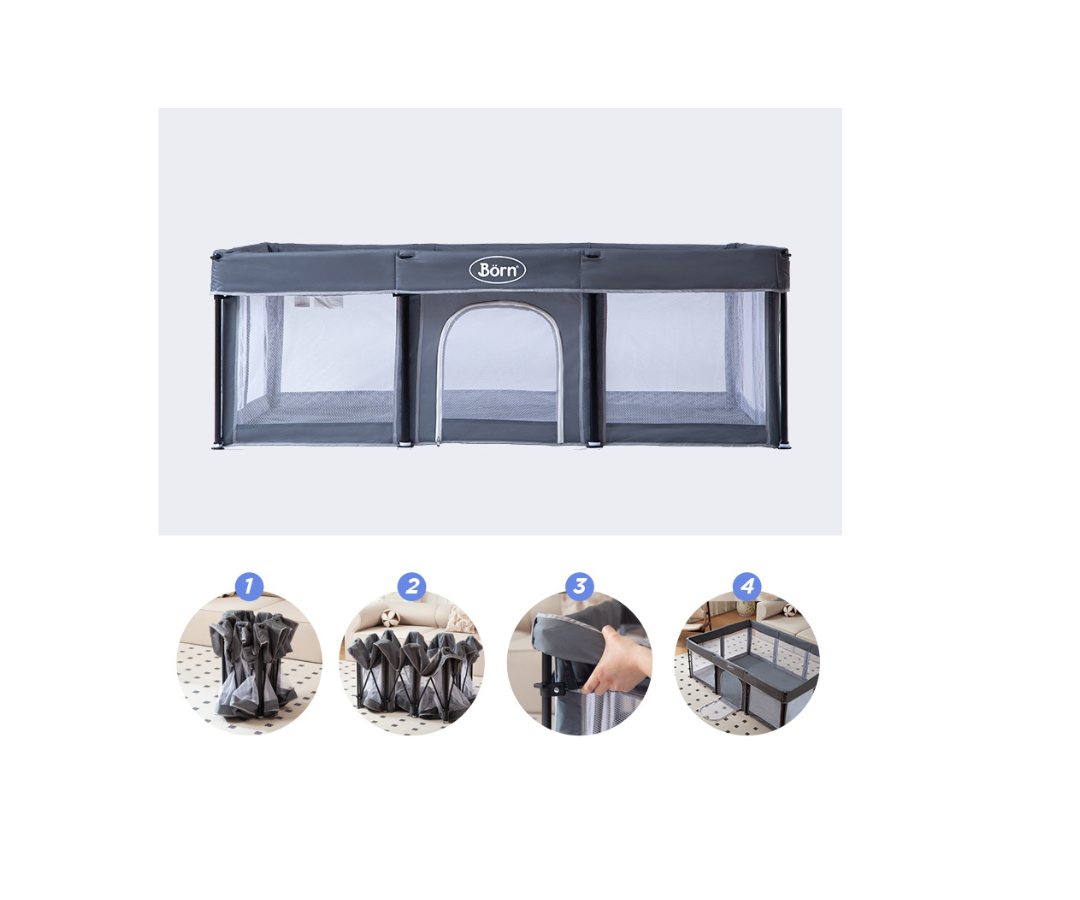 Este corral cuenta con paneles modulares que pueden ajustarse en diferentes formas y tamaños según el espacio disponible. Es ligero, resistente y muy sencillo de armar y desmontar, lo que lo convierte en una opción práctica tanto para el hogar como para llevar en viajes o visitas. Sus bordes redondeados y materiales de alta calidad aseguran máxima seguridad en cada uso.