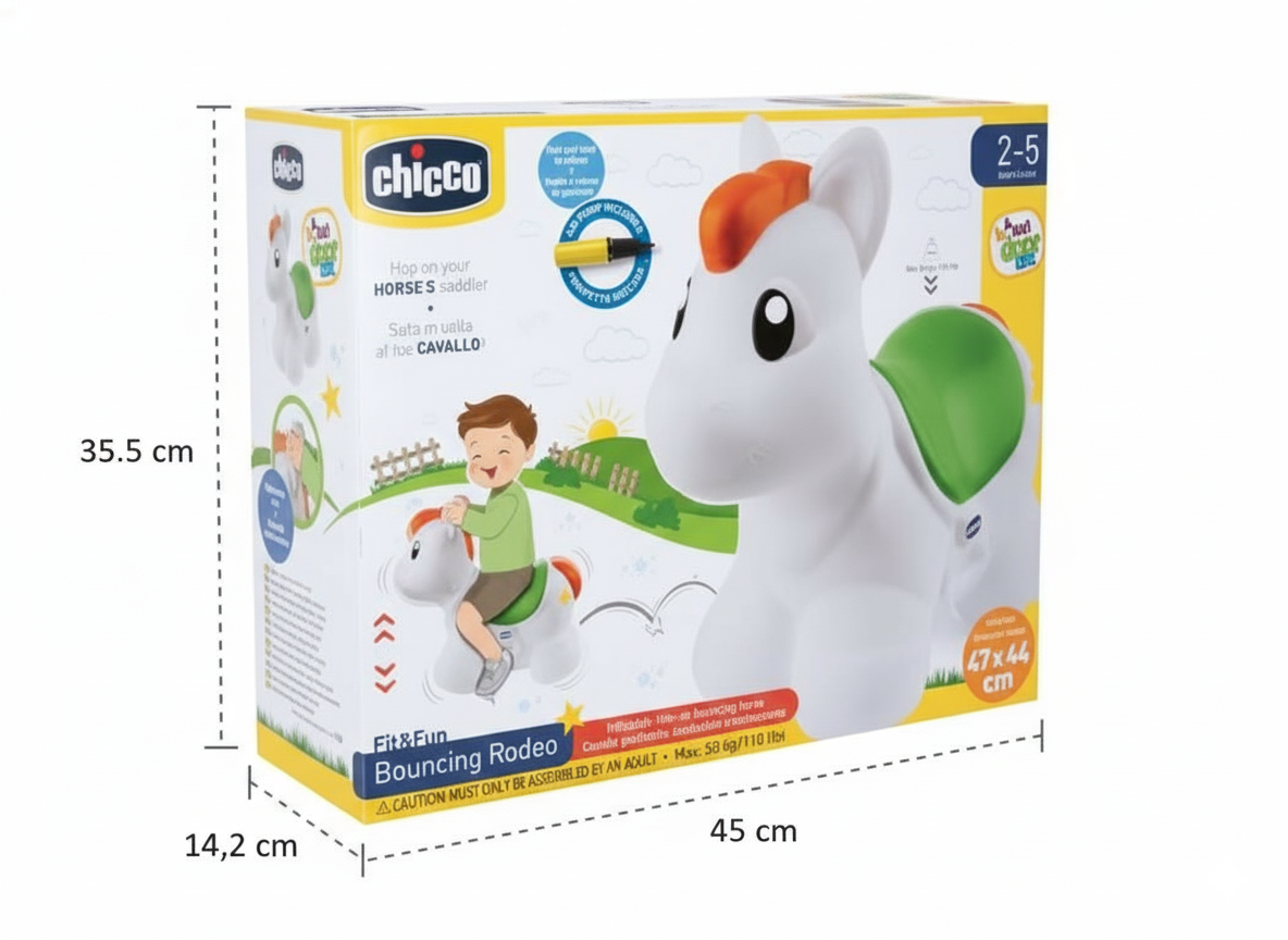 Este caballo inflable está diseñado para que los niños pequeños vivan momentos de pura diversión mientras saltan, se balancean y juegan con total libertad. Su forma amigable y su asiento ergonómico invitan a los peques a subir y dejarse llevar, ofreciendo una actividad llena de movimiento que pueden disfrutar tanto dentro como fuera de casa. Es un juguete pensado para crear risas, juego activo y experiencias memorables.