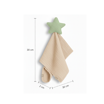 Su figura superior en forma de estrella facilita el agarre con manitos pequeñas, mientras que la manta inferior permite abrazar y acurrucarse con facilidad. Funciona como compañero de calma en siestas, paseos y momentos de transición, ayudando a reducir la ansiedad del bebé. Además, su estética sencilla y natural armoniza con habitaciones y espacios infantiles.