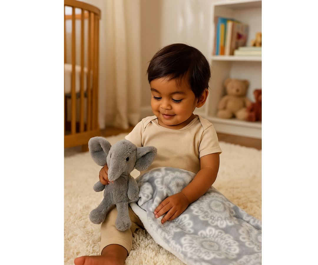 Este adorable set combina una manta de felpa suave con un tierno peluche 3D que estimula los sentidos del bebé. La textura cálida y delicada de la manta brinda confort en todo momento, ideal para dormir o acurrucarse.