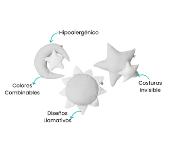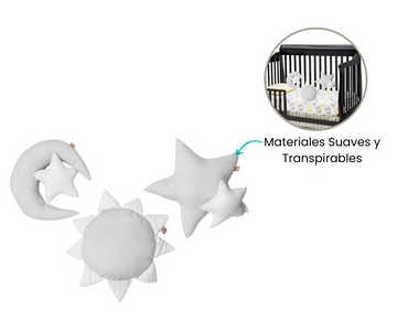 Cada cojín ha sido elaborado con materiales suaves y transpirables, especialmente seleccionados para garantizar el máximo confort de tu bebé durante sus momentos de descanso y sueño. La prioridad es crear un ambiente acogedor que fomente los sueños y el crecimiento saludable de tu pequeño.