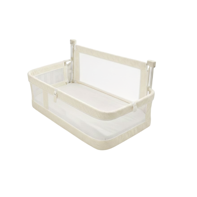 Diseñada para instalarse junto a la cama de los padres, esta cuna colecho incorpora laterales de malla transpirable que favorecen la circulación del aire y permiten una supervisión constante del bebé. Su estructura firme y sistema de sujeción aseguran estabilidad durante la noche, mientras que su baranda abatible facilita el acceso rápido y cómodo.