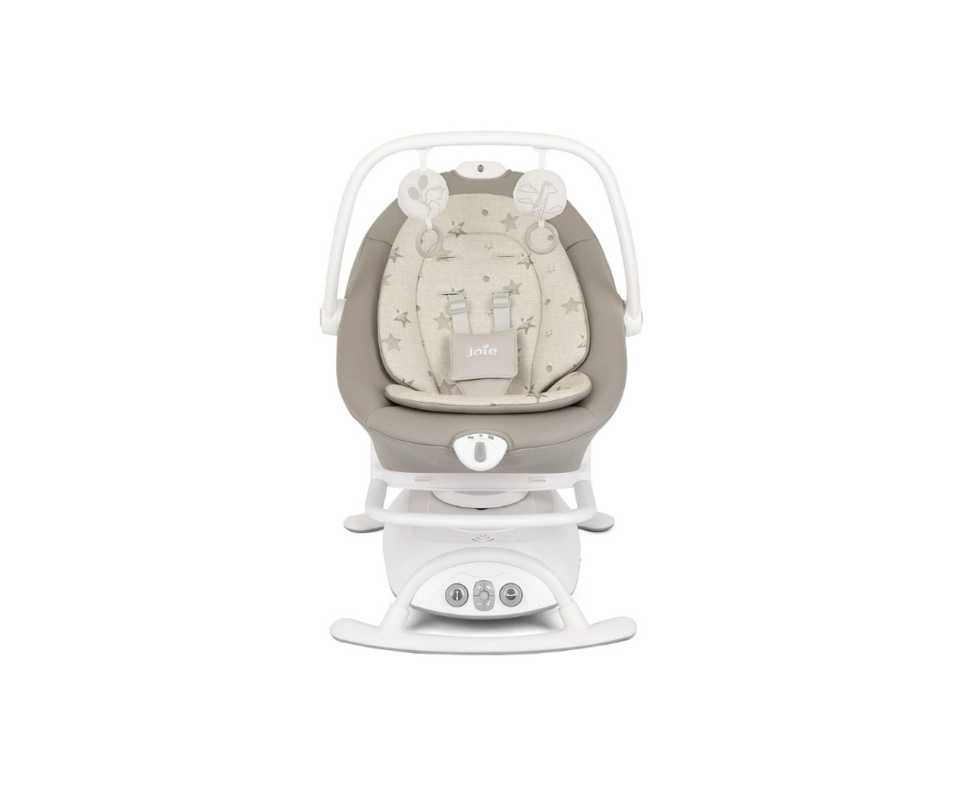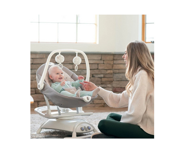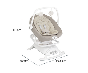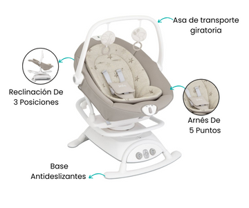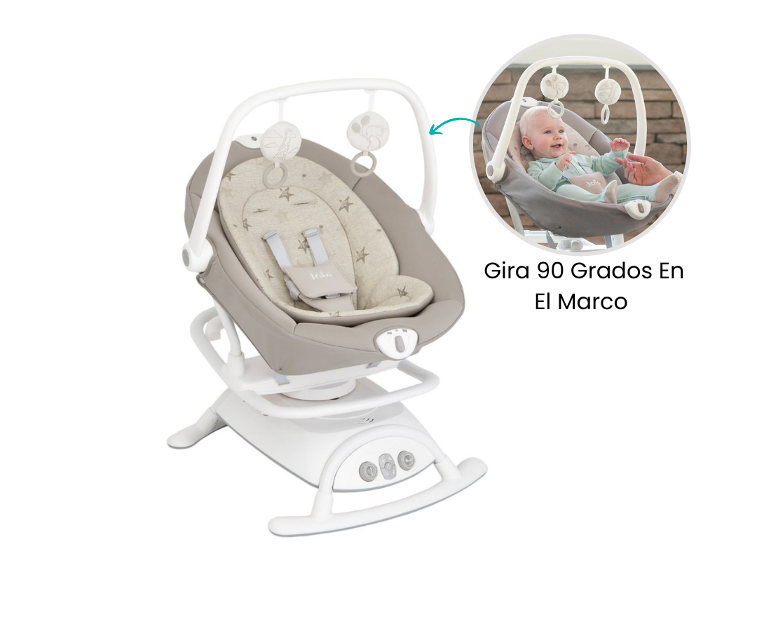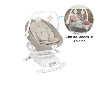 Este columpio está diseñado para brindar calma y seguridad desde los primeros días del bebé. Su asiento gira 90° sobre la base, permitiendo diferentes posiciones de movimiento y mayor versatilidad. Con suaves balanceos y un diseño ergonómico, ayuda a relajar y tranquilizar al pequeño. Ideal para acompañar al bebé en momentos de descanso y juego.