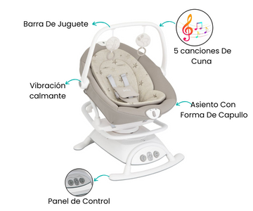 El columpio ofrece una experiencia completa con movimientos de lado a lado, de adelante hacia atrás o combinando ambos para mayor comodidad. Incluye 5 nanas clásicas y 5 sonidos de la naturaleza que ayudan a relajar al bebé en cualquier momento.