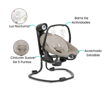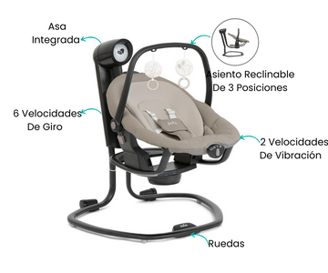 Este columpio brinda un balanceo suave en dos direcciones: de adelante hacia atrás o de lado a lado, adaptándose a las necesidades del bebé. Ofrece 6 velocidades de movimiento para elegir el ritmo ideal en cada momento. Incorpora 2 opciones de vibración que aportan mayor confort y relajación. Una solución práctica y versátil para mantener a tu pequeño tranquilo y cómodo.