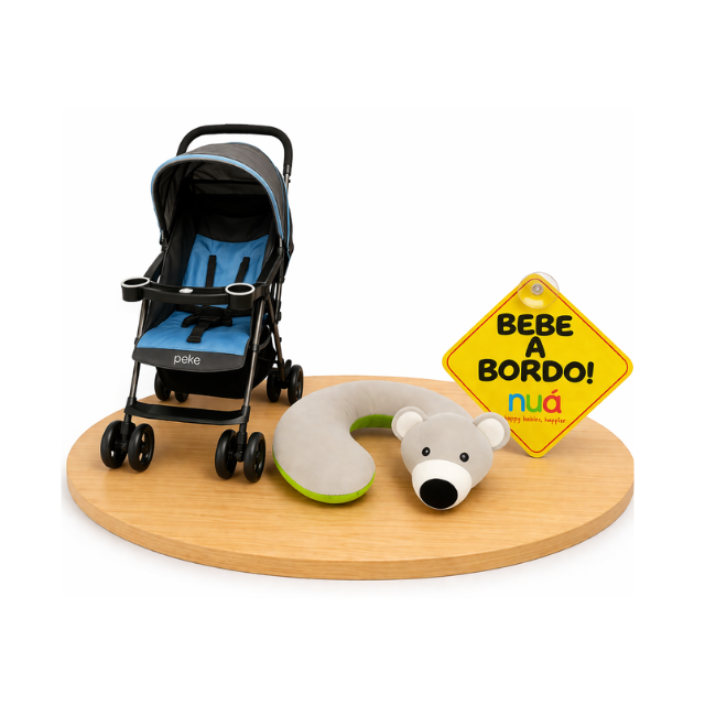 Este combo integra un coche funcional con una almohada de viaje ergonómica y una señal de seguridad para el auto. Su diseño permite acompañar al bebé en diferentes situaciones, desde paseos hasta viajes, brindando soporte, confort y protección.
