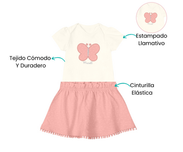 La falda, con un corte moderno y detalles adorables, complementa el conjunto añadiendo un toque de elegancia y frescura. Ideal para ocasiones especiales o para el día a día, este conjunto permite libertad de movimiento sin sacrificar el estilo. Perfecto para que las niñas luzcan adorables mientras juegan, exploran o simplemente disfrutan de su día.