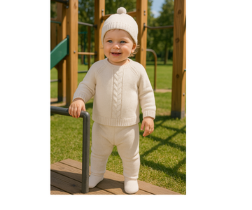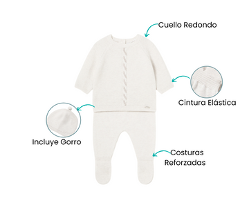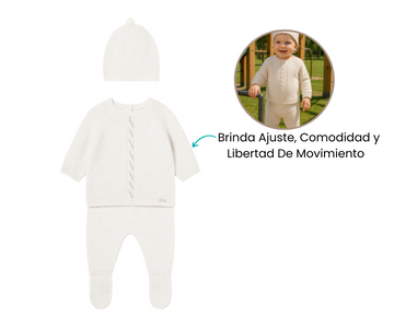 Este conjunto es perfecto tanto para paseos como para estar en casa. El diseño tricotado aporta textura y un acabado delicado. Sus costuras cuidadas y materiales de alta calidad son sello de la marca. Fácil de poner y quitar, es práctico para el día a día. Una prenda adorable y funcional que enamora a simple vista.