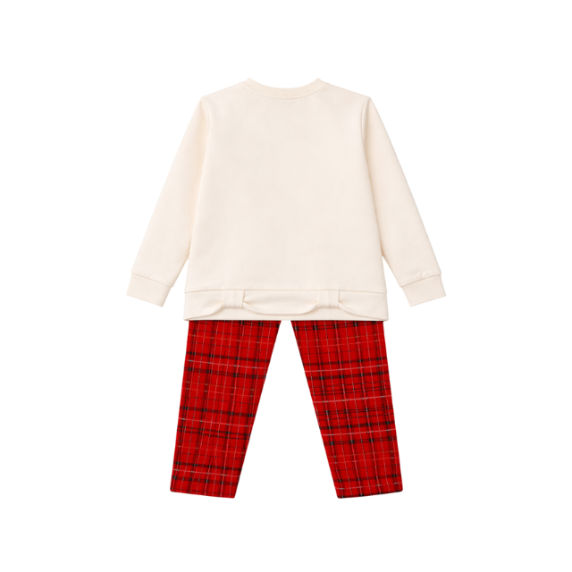 - Colores: Crema + rojo con diseño tipo tartán.