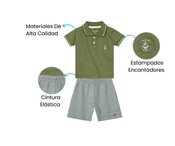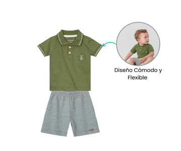 El conjunto es perfecto para los días de sol, combinando estilo y comodidad en cada detalle. La camiseta está diseñada con un suave tejido que permite una ventilación ideal, manteniendo fresco al bebé mientras juega.