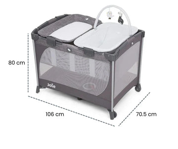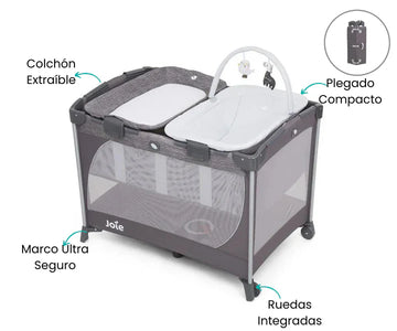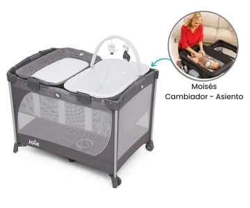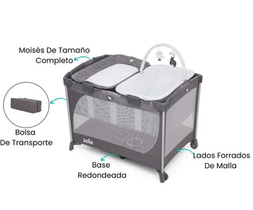 Descubre el práctico corral de Joie tu aliado para viajar sin esfuerzo. Fácil de manejar y brindando comodidad en cualquier lugar, tanto para ti como para tu bebé. Diseñada para asegurar una noche de sueño reparador y un juego seguro durante el día. Con accesorio de moisés para una posición de reposo elevada, ideal para recién nacidos