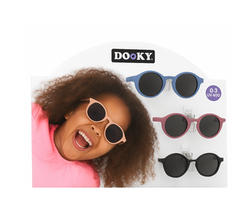 Este display incluye gafas Dooky súper resistentes y cómodas, ideales para niños de 0 a 3 años. Con protección UV 100%, lentes polarizadas y opciones con banda elástica o patillas flexibles, combina seguridad con comodidad. Un producto pensado para aventuras al sol.