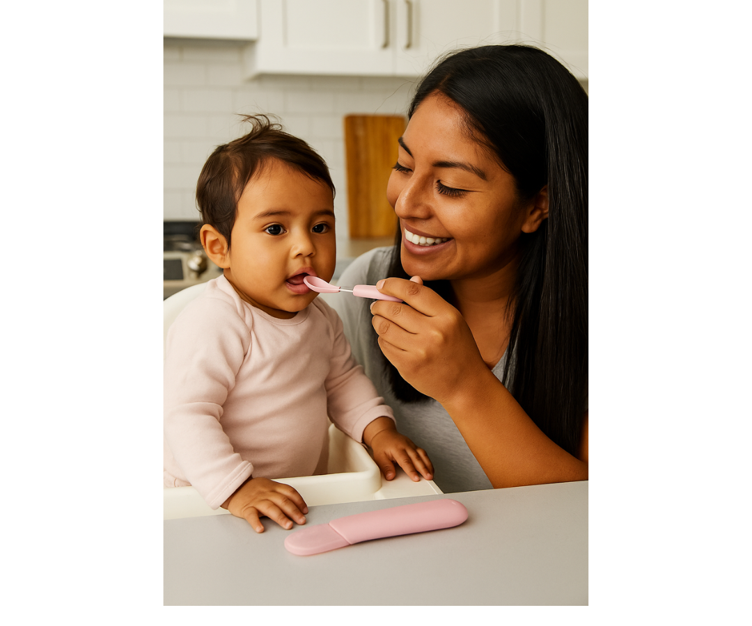 ,Esta cuchara de silicona está diseñada especialmente para cuidar las delicadas encías y la boca de tu bebé. Su textura suave y flexible ofrece una alimentación cómoda y segura desde las primeras papillas. Ideal para bebés en etapa de transición a sólidos, permite una experiencia agradable en cada bocado. Además, incluye un práctico estuche que la mantiene limpia y lista para usar en cualquier lugar