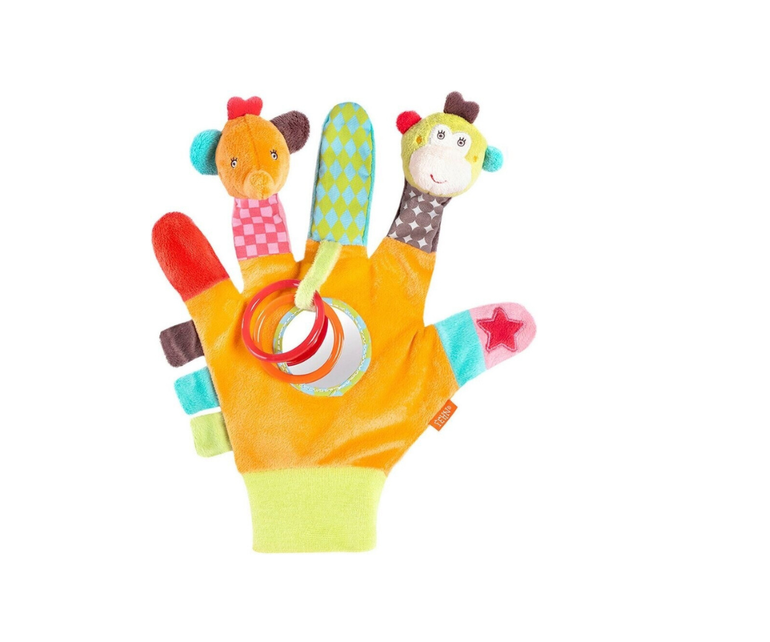 Este guante cuenta con detalles que promueven la motricidad fina: espejito, aros móviles, etiquetas sensoriales y materiales suaves. Diseñado para adaptarse cómodamente a la mano del adulto, permite crear historias, juegos y sonidos que capturan la atención del bebé.