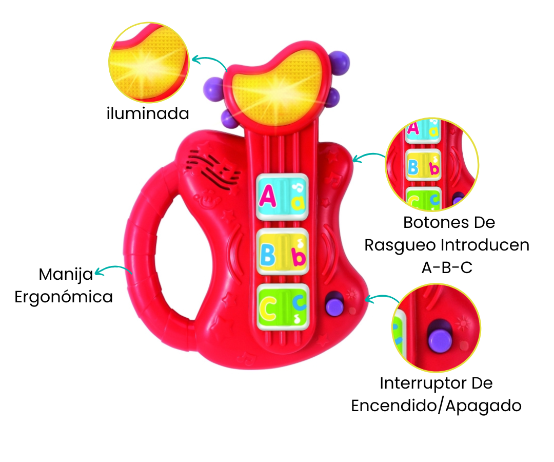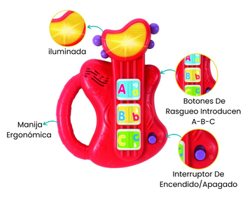 La guitarra iluminada es una herramienta lúdica que introduce a los pequeños en el aprendizaje temprano de manera divertida. A través de luces, sonidos y melodías, estimula habilidades cognitivas, sensoriales y motoras. Cada nota y color despierta la curiosidad del bebé, favoreciendo el desarrollo desde los primeros meses.