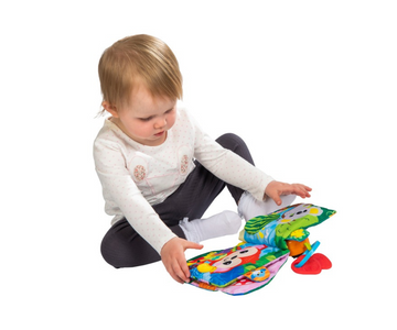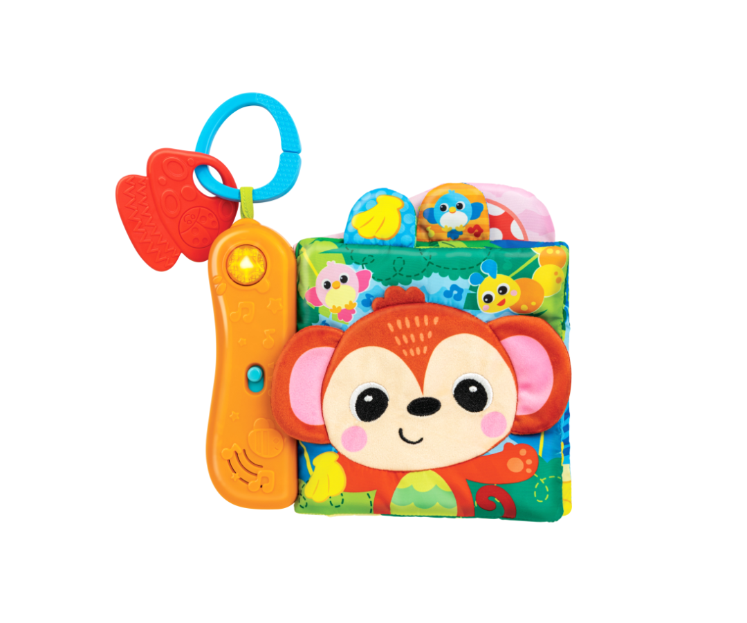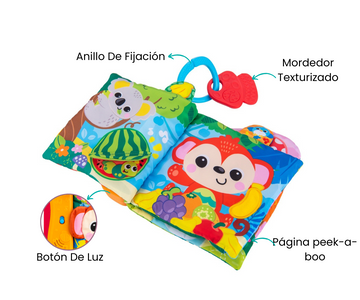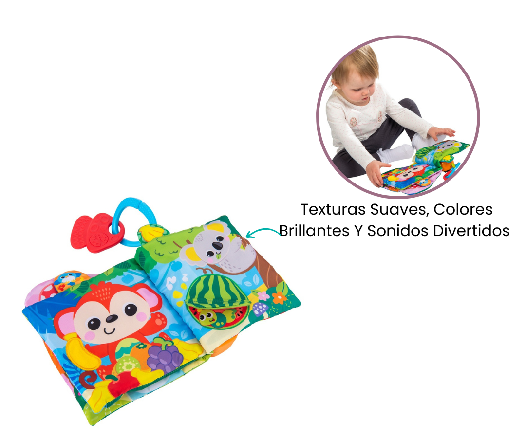 - Libro sensorial suave y divertido con mordedor texturizado.