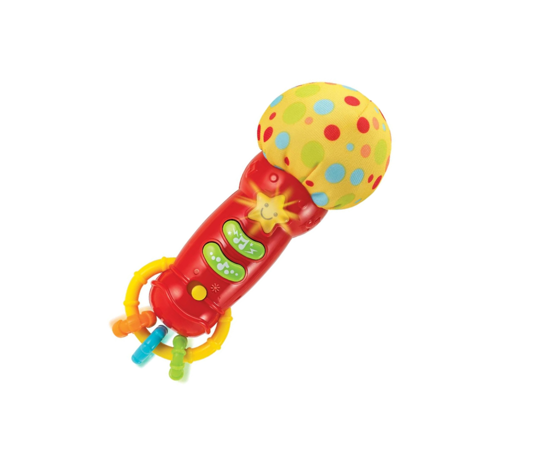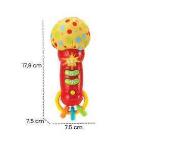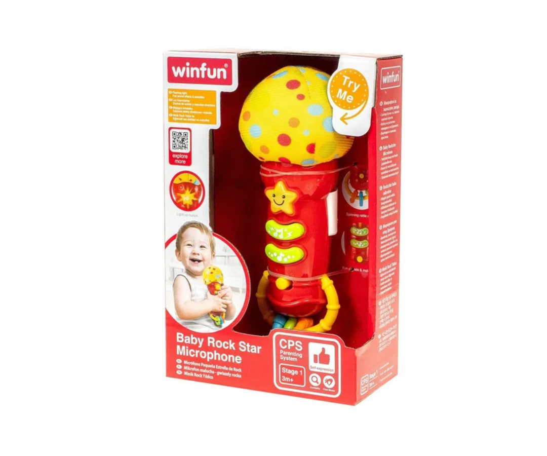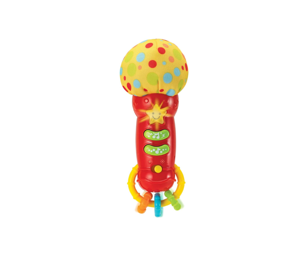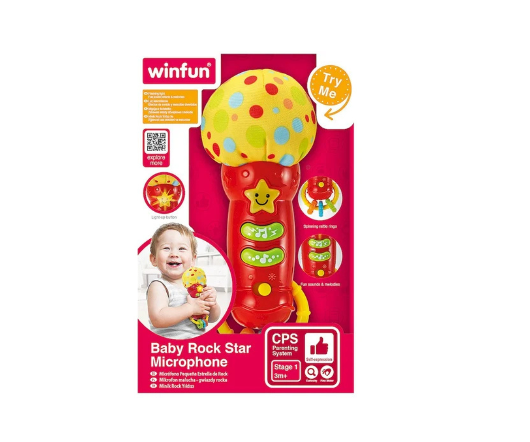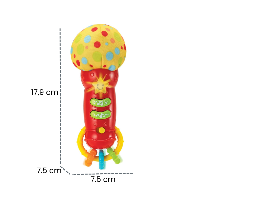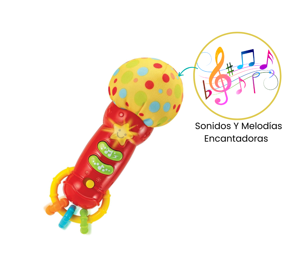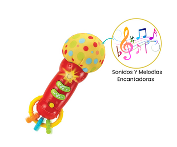 El divertido micrófono para bebé Winfun es ideal para los pequeños amantes del sonido. Al presionar su botón luminoso, se activan efectos sonoros y melodías que estimulan la audición y la curiosidad. Incluye diferentes instrumentos para explorar y disfrutar.