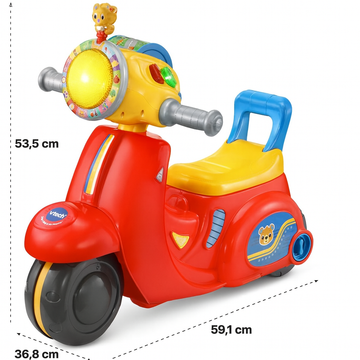 Con solo girar la llave, el motor se enciende con sonidos realistas que motivan el juego de rol. El mapa de rodillo y el faro delantero invitan a imaginar viajes por la ciudad, mientras los botones del tablero enseñan frases de conteo, seguridad vial y colores. Además, las melodías y canciones incorporadas estimulan el lenguaje y el aprendizaje en cada paseo.