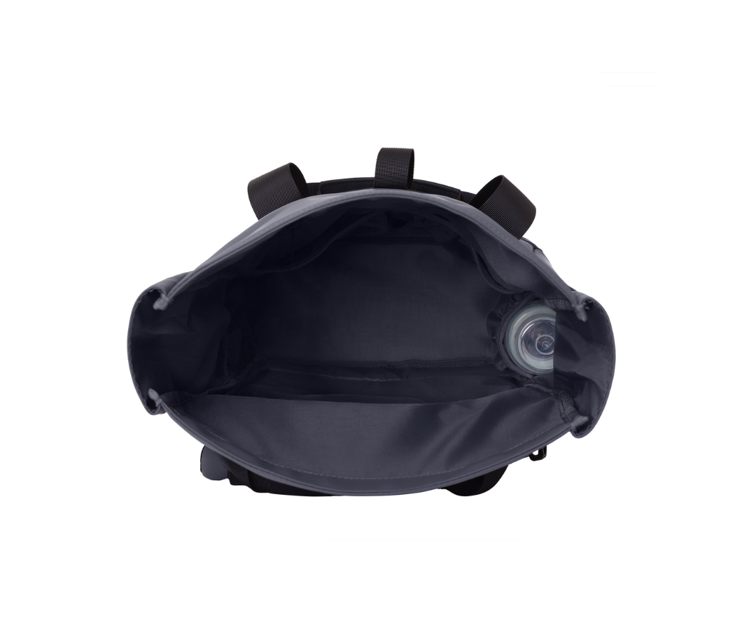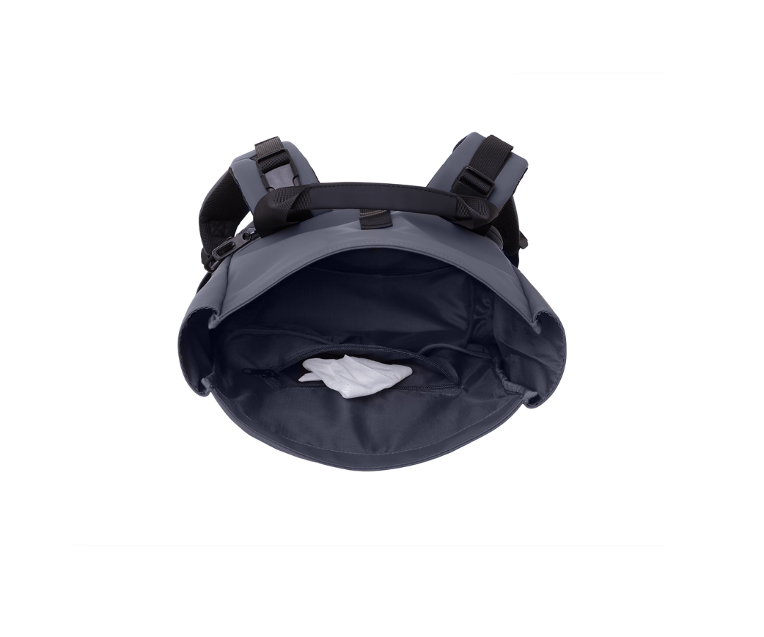 - Bolsillo principal, amplia apertura con cierre magnético y tapa enrollable con hebilla.