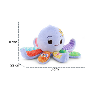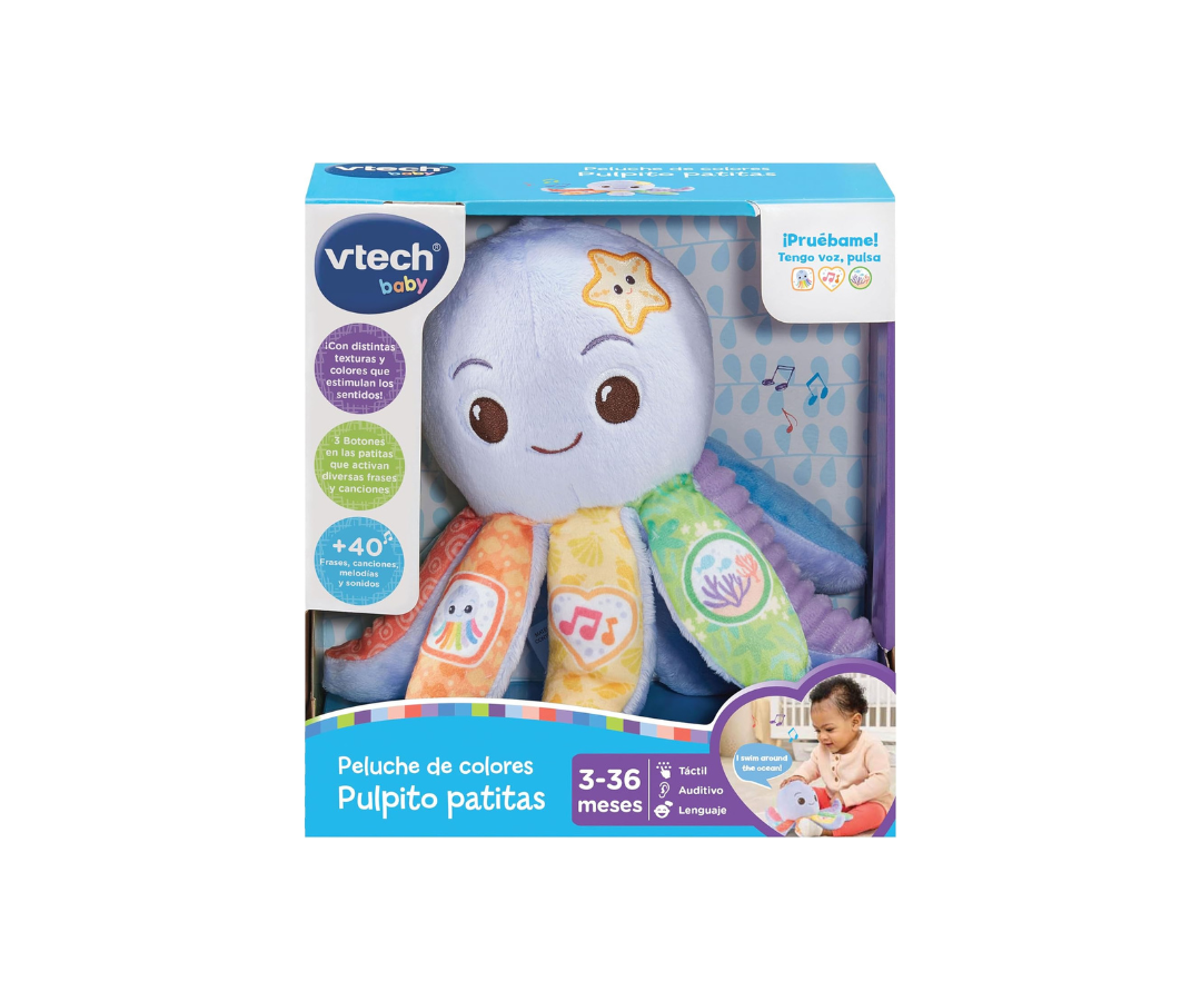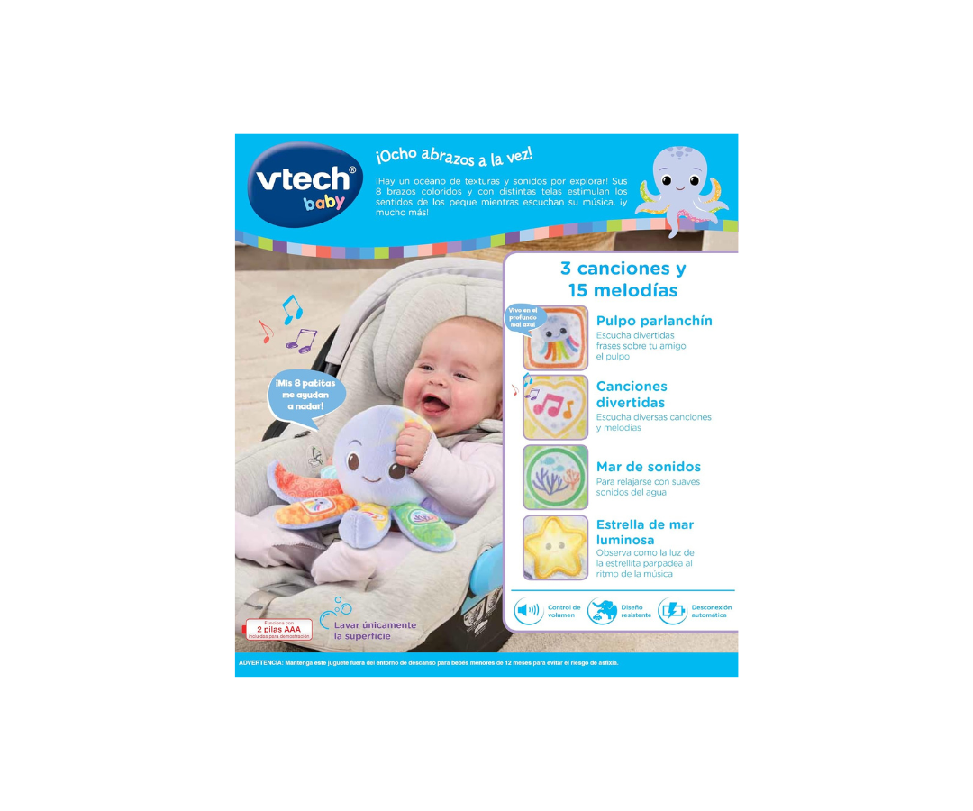 Cuenta con tres botones en sus tentáculos que activan frases, canciones y sonidos de la naturaleza, ayudando al desarrollo cognitivo y auditivo. Su estrella luminosa se enciende al ritmo de la música, creando un ambiente mágico que atrae la atención del bebé y fomenta la interacción. Con más de 40 frases y melodías, es un compañero ideal para estimular el lenguaje y la imaginación desde los primeros meses.