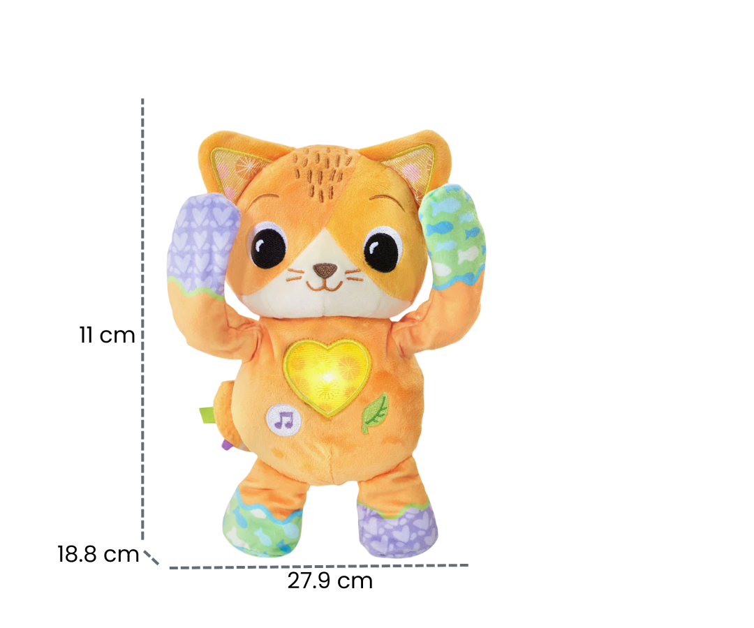 El botón en forma de corazón permite controlar los movimientos del gatito, introduciendo a los niños en el concepto de causa y efecto de manera sencilla y divertida. Además, cuenta con botones musicales en forma de notas y hojas que reproducen canciones, melodías y sonidos de la naturaleza. De esta forma, se convierte en un juguete que no solo entretiene, sino que también estimula la imaginación y el aprendizaje temprano.