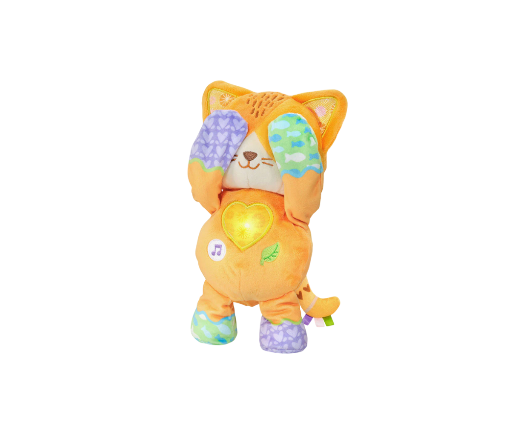 Este adorable gatito interactivo invita a los niños a jugar al escondite, ayudándolos a comprender que el objeto no desaparece aunque no lo vean. Con sus patas estampadas cubre y descubre los ojitos, generando sorpresa y emoción en cada repetición. Los pequeños quedarán cautivados al descubrir que su amigo peludo siempre está ahí para seguir jugando.