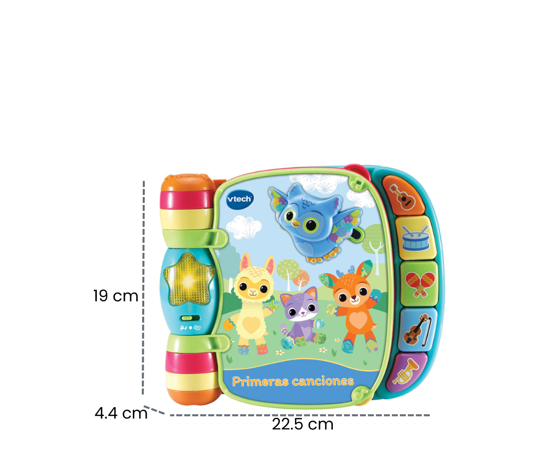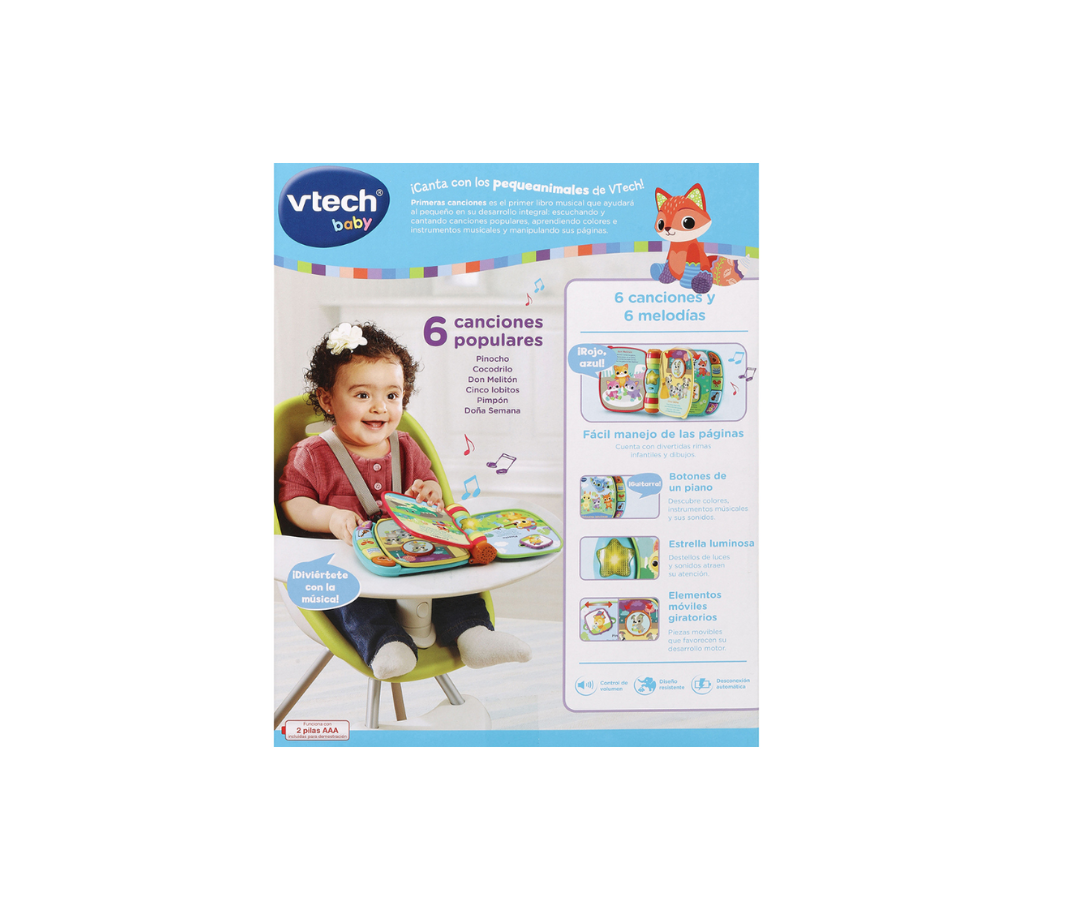 El Libro Primeras Canciones de VTech es el compañero ideal para bebés a partir de 6 meses, pensado para estimular el desarrollo de forma divertida. Con páginas ilustradas, melodías y personajes entrañables, cada momento se convierte en una oportunidad de aprendizaje. Estimula la curiosidad, la imaginación y los sentidos mientras el bebé canta, explora y disfruta de sus primeras canciones.