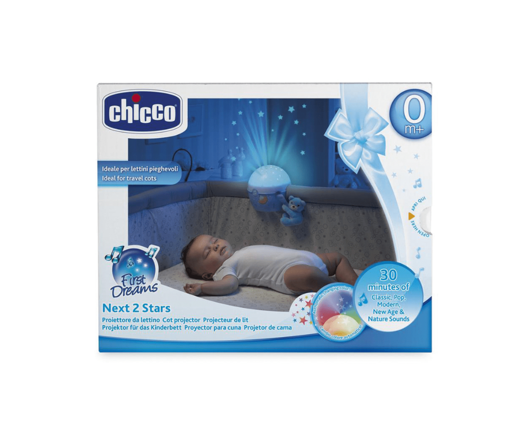 El Proyector 2 en 1 de Chicco crea un ambiente mágico y relajante para ayudar al bebé a conciliar el sueño. Diseñado para usarse como proyector de cuna o lámpara de mesa, transforma cualquier habitación en un espacio lleno de calma, música y luces suaves. Ideal desde los primeros días, combina tecnología y ternura para acompañar la rutina del descanso.
