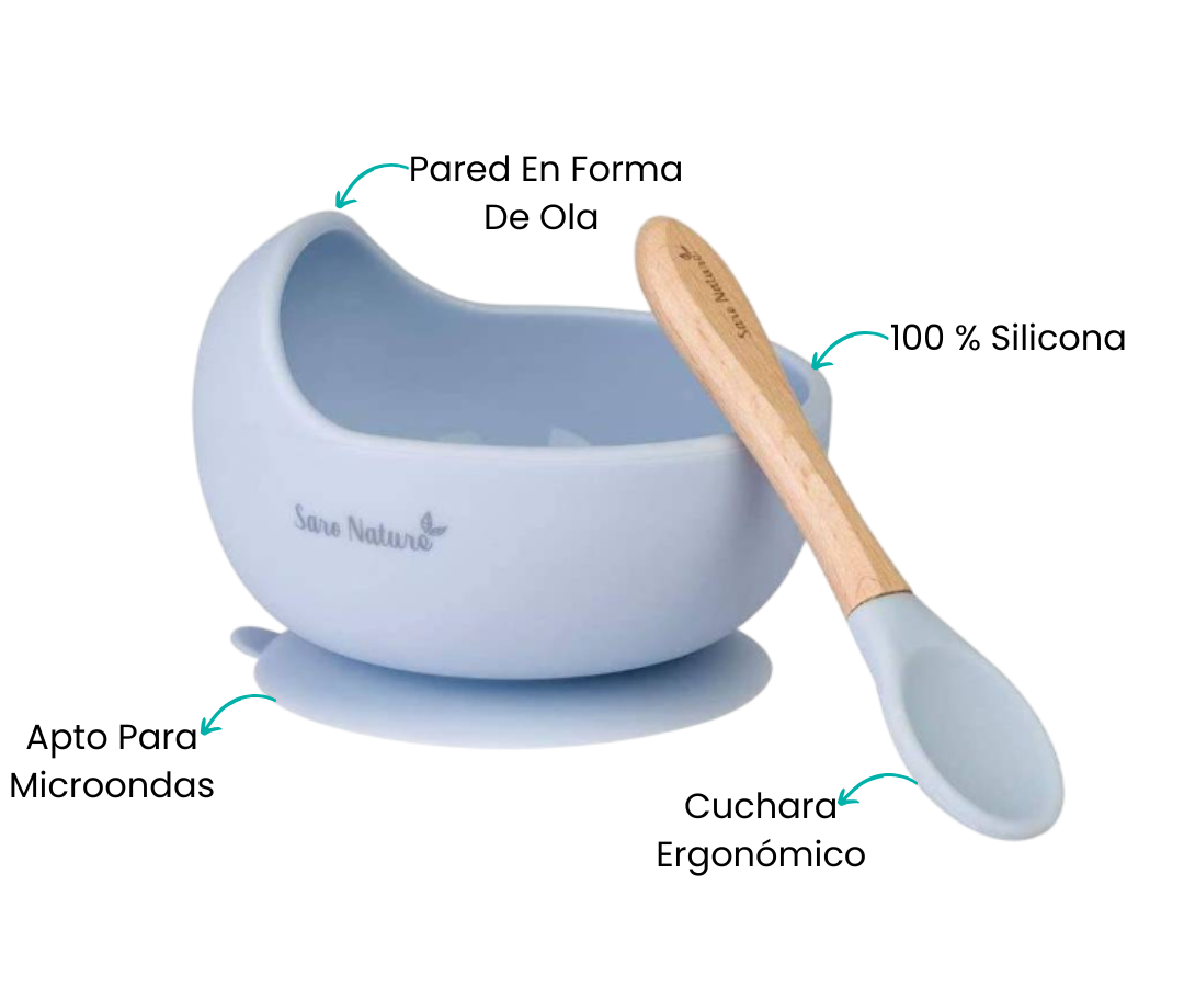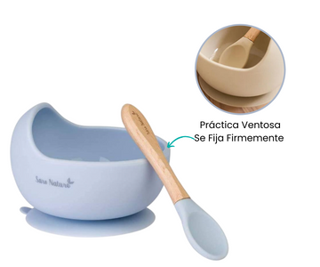 Su práctica ventosa en la base lo mantiene firmemente adherido a la mesa, evitando cualquier derrame. La cuchara, hecha de silicona suave, cuenta con un mango de madera que proporciona un agarre cómodo y seguro. Ideal para los más pequeños de la casa, este set garantiza una alimentación segura y sin complicaciones.