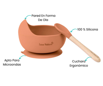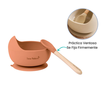 Su práctica ventosa en la base lo mantiene firmemente adherido a la mesa, evitando cualquier derrame. La cuchara, hecha de silicona suave, cuenta con un mango de madera que proporciona un agarre cómodo y seguro. Ideal para los más pequeños de la casa, este set garantiza una alimentación segura y sin complicaciones.