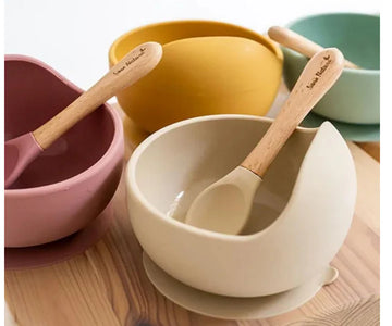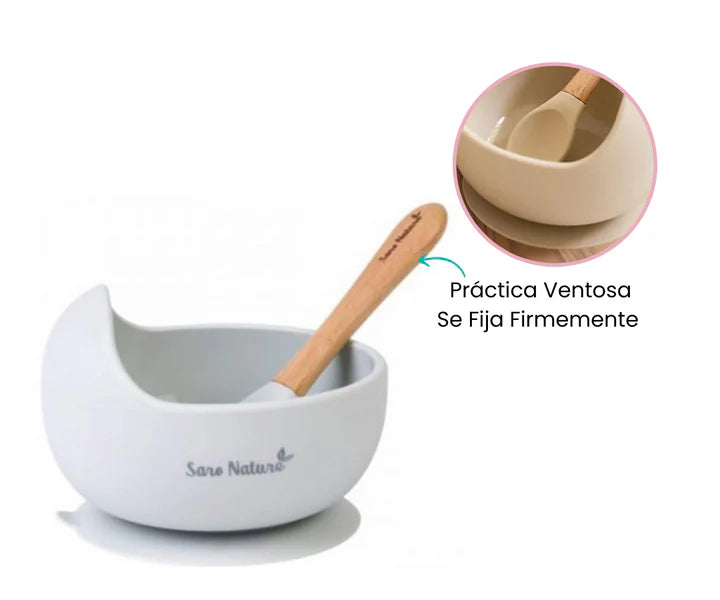 Su práctica ventosa en la base lo mantiene firmemente adherido a la mesa, evitando cualquier derrame. La cuchara, hecha de silicona suave, cuenta con un mango de madera que proporciona un agarre cómodo y seguro. Ideal para los más pequeños de la casa, este set garantiza una alimentación segura y sin complicaciones.