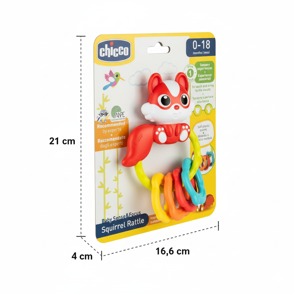 Las cuatro bellotas de plástico blando ofrecen una superficie segura para morder, perfecta para aliviar las encías durante la dentición. Al agitarlo, el sonajero produce un tintineo delicado que fomenta la percepción auditiva y la relación causa–efecto. Su anillo de gran tamaño facilita un agarre cómodo y estable, ayudando al bebé a fortalecer su motricidad fina mientras experimenta diferentes texturas y movimientos.