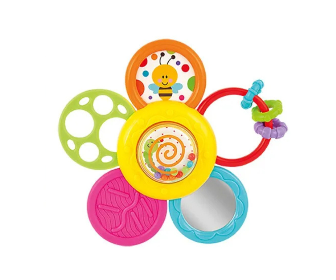 Los cuatro sonajeros y mordedores están diseñados con distintas texturas, formas y colores para captar la atención de tu bebé. Estimulan el tacto, la vista y la coordinación mientras alivian la molestia de la dentición.