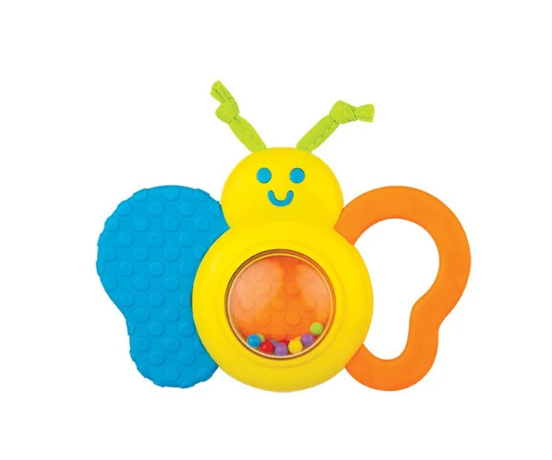 - Mariposa de fácil agarre con alas texturizadas y cuentas de sonajero.