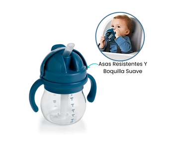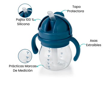 El vaso de 6 Oz. con asas, es ideal para niños de 6 meses en adelante. Con una pajilla de silicona suave de una sola pieza, aseguramos un aprendizaje sin derrames, mientras que las asas resistentes y la forma contorneada ofrecen un agarre fácil de manejar. ¡Haz que la transición a los vasos sea una experiencia cómoda y segura para tu pequeño!