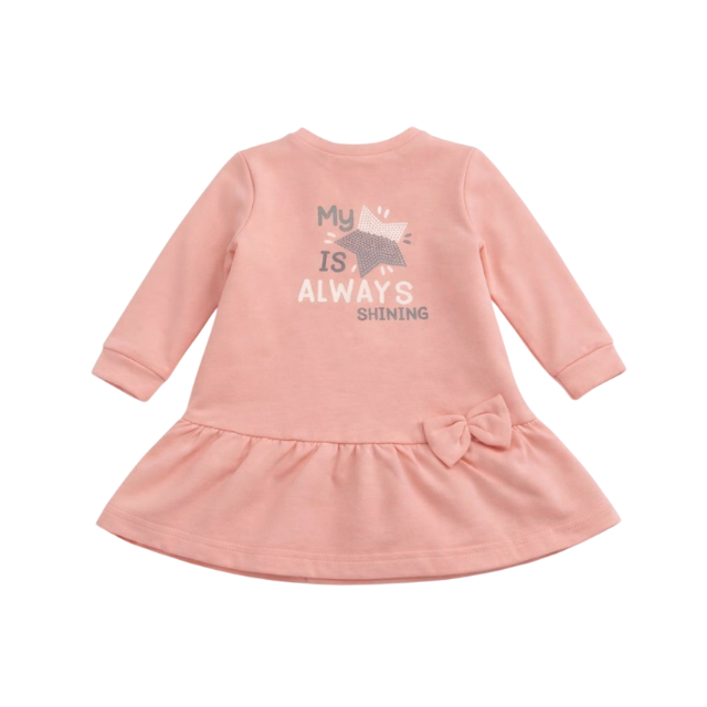 Este vestido infantil de algodón con manga larga ofrece una sensación suave y agradable para la piel delicada del bebé. Su diseño incluye un estampado frontal con estrella y frase decorativa, además de una falda con ligero vuelo y un delicado lazo lateral, creando un look dulce y cómodo que permite libertad de movimiento durante todo el día.