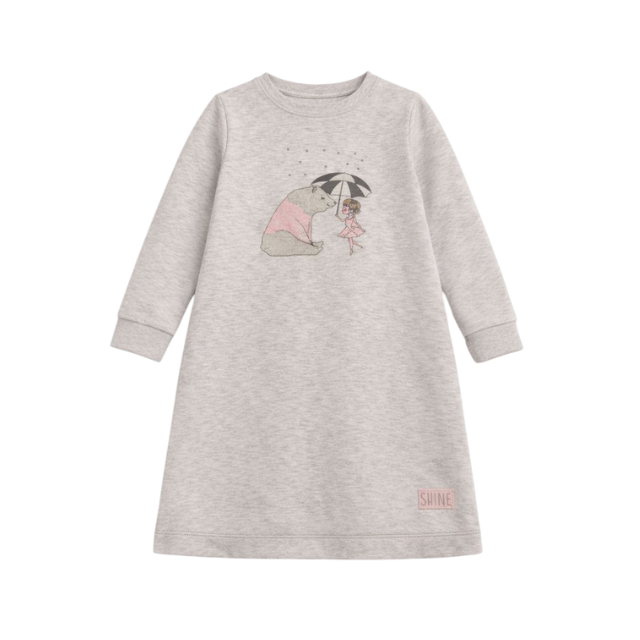 Este vestido infantil de manga larga está confeccionado con una tela suave que brinda una sensación agradable en la piel delicada del bebé. Su diseño presenta un estampado frontal con una ilustración infantil de oso y niña bajo un paraguas, creando un look dulce y tierno. Además, su corte recto permite que la bebé se mueva con comodidad mientras se mantiene abrigada.