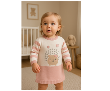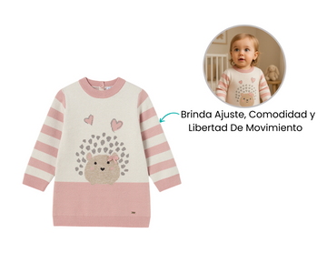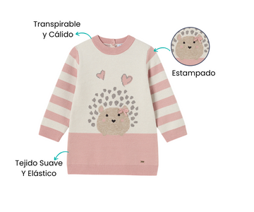 Este delicado vestido tricot en tono rubor es ideal para bebés confeccionado en un tejido suave y cálido, perfecto para mantener el confort en días frescos. Su diseño clásico incorpora detalles de punto fino que aportan elegancia y ternura. El color rubor, suave y atemporal, combina fácilmente con otros tonos neutros o pastel.