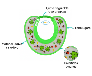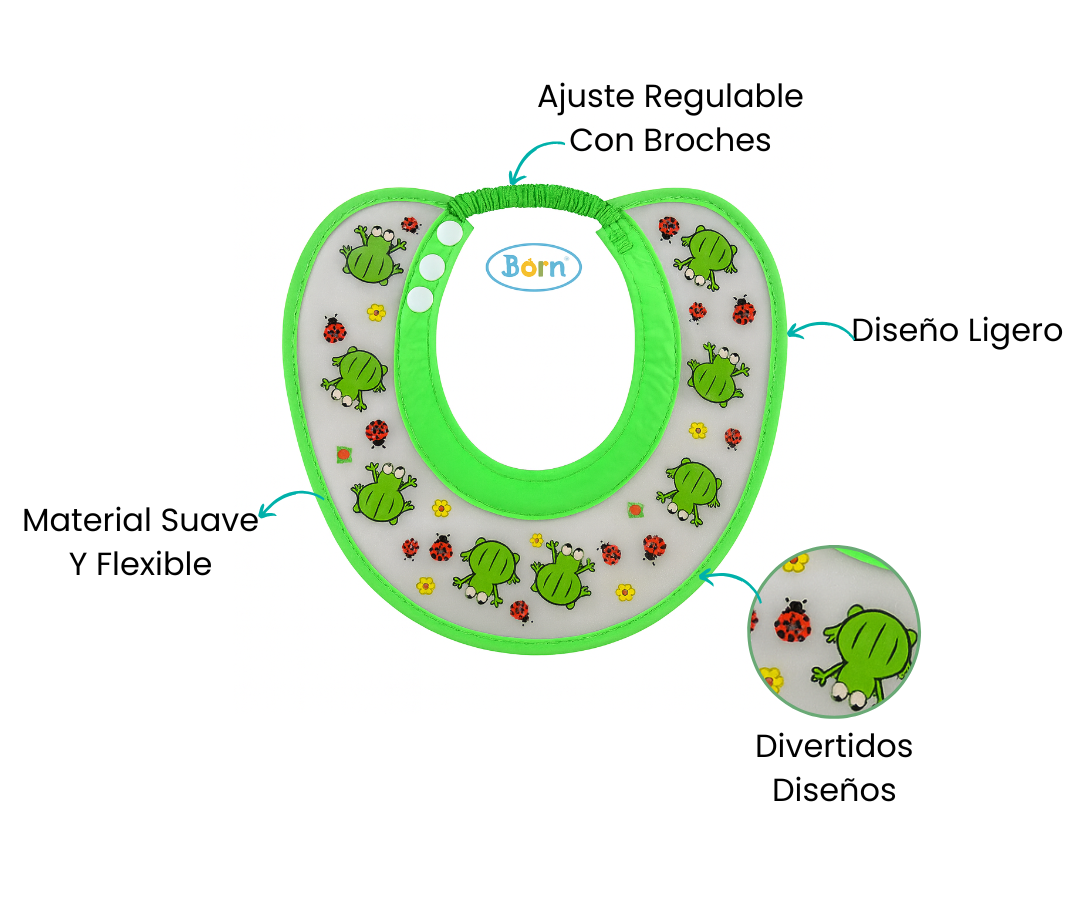 Fabricada con materiales suaves y resistentes al agua, esta visera cuenta con un sistema de ajuste cómodo que se adapta a la cabeza del bebé sin causar molestias. Sus bordes acolchados y su diseño divertido con ranitas y mariquitas convierten la rutina de higiene en un momento seguro y entretenido.